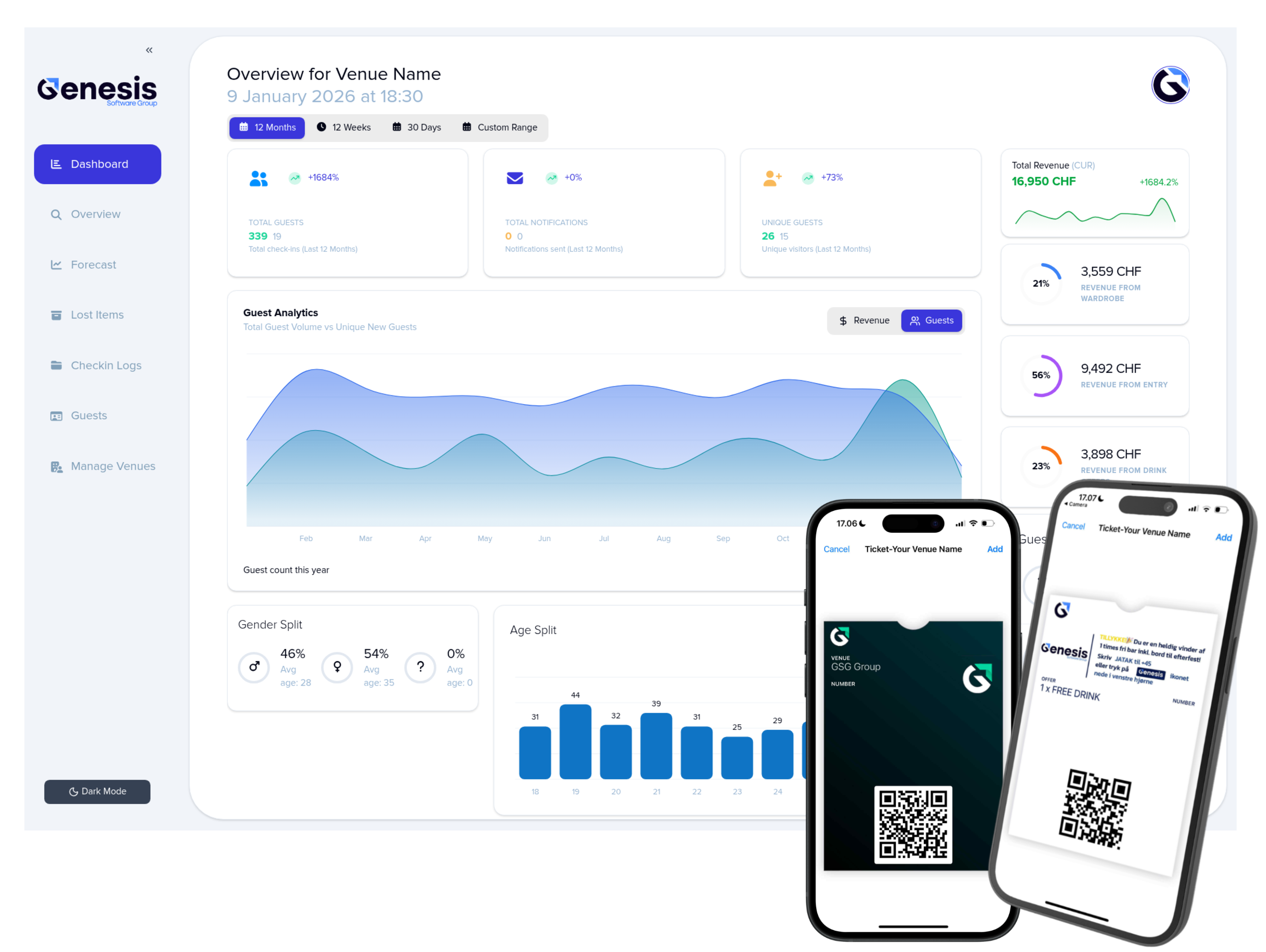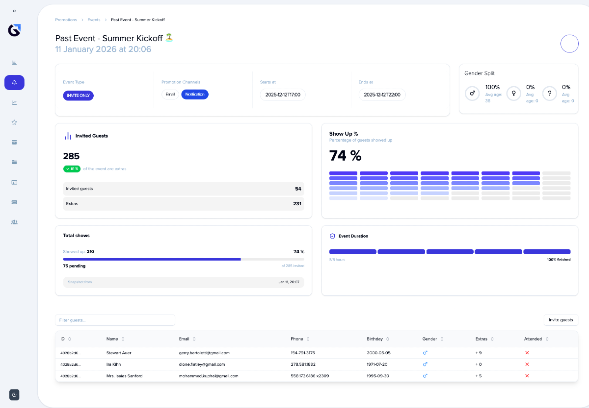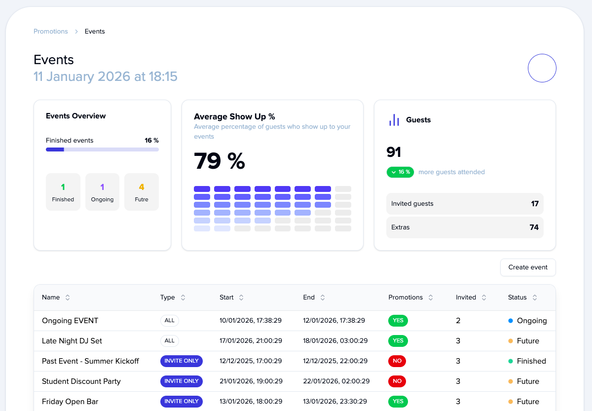Følg alle dine events – tidligere, aktuelle og kommende. Se deltagelse, køns- og aldersfordeling, +1 deltagelse og real-time gæstetjek-ins. Forecast fremtidige events, inkl. maks inviterede gæster og extras.