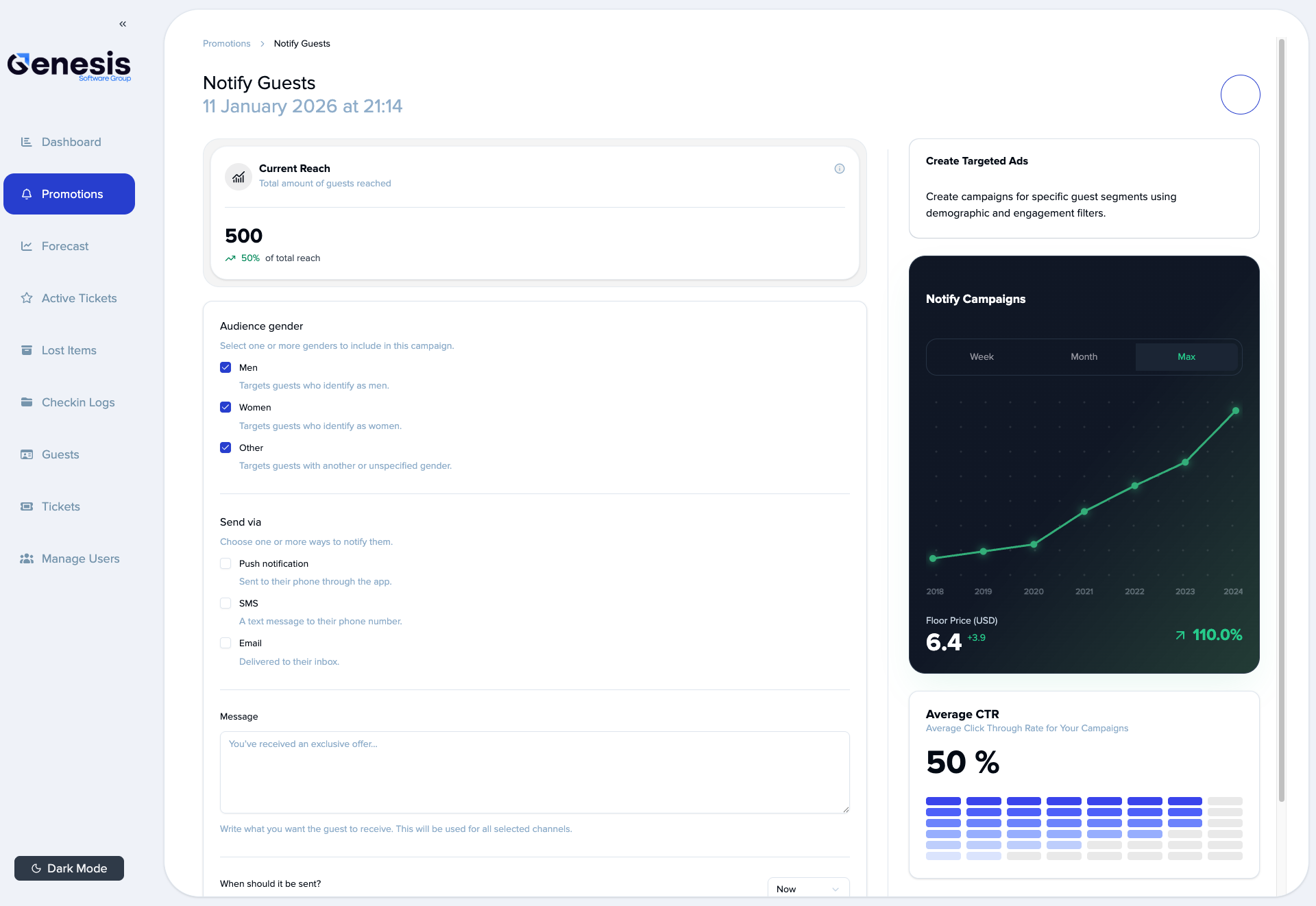 Nå dine gæster via wallet-notifikationer, email, SMS og andre kanaler for at maksimere reach.